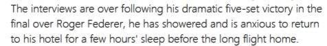 我的理解是三个并列句,省略第一个and并用,代替。 第一个:The interviews are over following his dramatic five-set victory in the final over Roger Federer(,) 第二个:he has showered (and) 第三个:(he) is anxious to return to his hotel for a few hours' sleep before the long flight home. 由于第二个句子和第三个句子是同一主语,进而第二个句子省略了主语 希望能帮到你 |