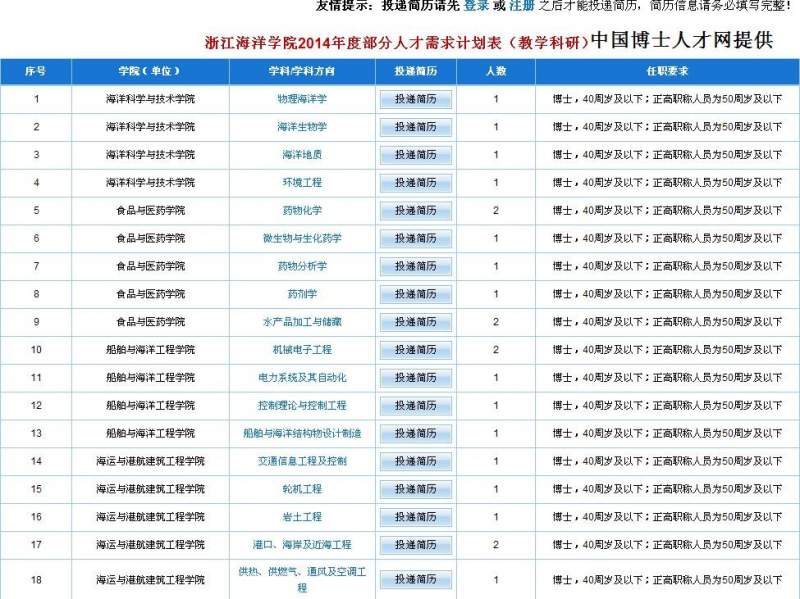 浙江海洋学院2014年诚聘海内外高层次人才 一、常年诚聘对象及相关工作待遇http://61.153.216.111/rcjlzx/News/view.asp?id=232 根据已经列入国家发展战略的浙江海洋经济发展示范区和浙江舟山群岛新区的建设及浙江海洋大学创建需要,引进海洋科学、工程海洋学、生物化学与分子生物学、海洋生物增养殖技术、海洋环境与生态、海洋信息与技术管理、海洋生物医药、渔业资源生物学、渔业环境与资源修复技术、渔具理论与负责任捕捞技术、水产品质量与安全、水产品精深加工、现代船舶设计与制造、船舶设备与动力工程、船舶力学与海洋工程流体性能、涉海机械数字化设计方法与应用、海洋机电装备工程控制技术、海洋机电系统检测与通信技术、海洋与海岸工程、临港先进制造技术与海洋工程防护、航运信息技术与控制、航运安全保障技术、港航物流规划与管理、油气储运与加工环保节能技术、油气储运工程建设与油气储运技术、油气储运与加工安全工程技术、海洋社会与文化、海洋文献与文学、公共政策与海洋法律、海岛与海域管理、海洋与海岸带旅游开发、滨海运动与休闲等相关学科专业人才。 三、应聘程序及联系方式 应聘人员可通过电子邮件或投递纸质稿简历的方式提交应聘材料。如通过电子邮件求职,邮件主题请注明:姓名、应聘岗位,应聘材料以附件形式发送;纸质稿请递交到浙江海洋学院人事处人才科。 通讯地址:浙江省舟山市定海区临城街道海大南路1号浙江海洋学院人事处 邮政编码:316022 联 系 人:王老师、张老师; 联系电话:0580-2550017;传 真:0580-2550017 电子信箱:zhyrsc@163.com 网址:www.zjou.edu.cn QQ图片20140423110033.jpg QQ图片20140423110120.jpg QQ图片20140423113203.jpg QQ图片20140423113244.jpg [ Last edited by rsczhy on 2014-4-23 at 11:33 ] 浙江海洋学院2014年诚聘海内外高层次人才(长年招聘) [ Last edited by rsczhy on 2014-6-4 at 09:07 ] |