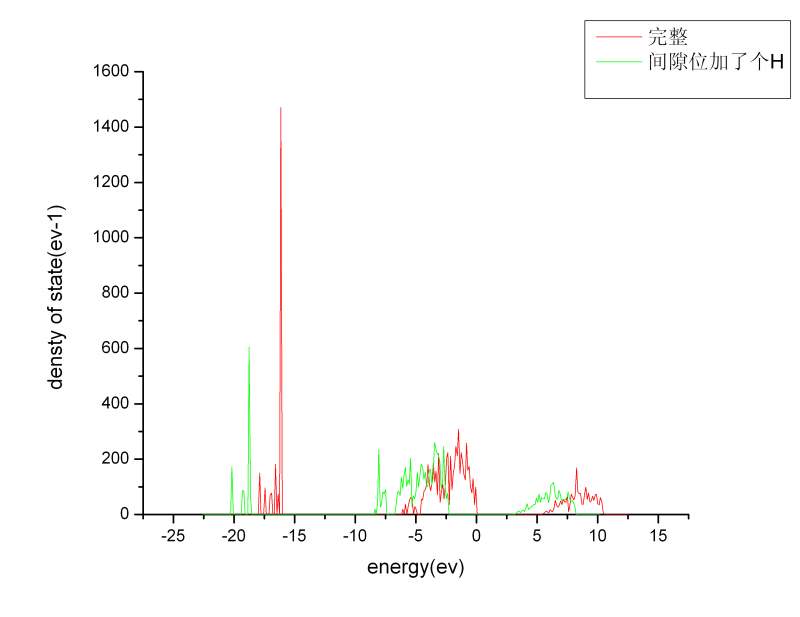 最近算了一个体系的态密度,画出了总态密图;如下图:红色是完整晶体的总态密度图,绿色是在间隙位加了H原子的总态密度图;很明显,感觉绿色的线整体向后移动了一段距离,不知道这是什么原因引起的????难道加H原子材料的性质发生了什么变化???菜鸟一枚,请各位高手教教我!!! Graph22.jpg |