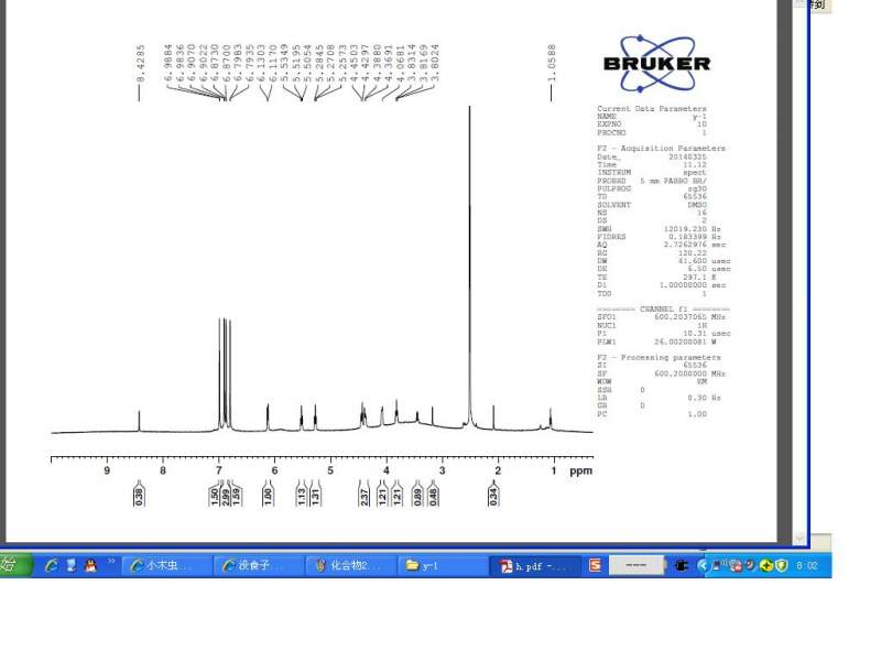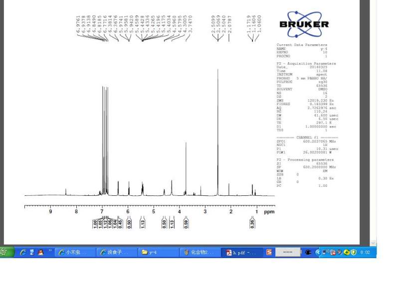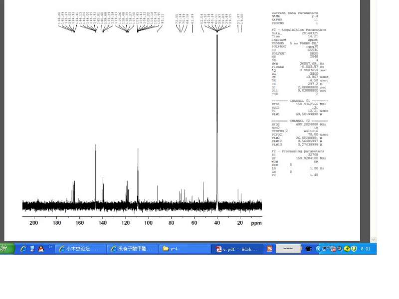 最近送了两个化合物打谱,用的是DMSO,在氢谱和碳谱出现了:氢谱化学位移 7.0附近出现强簇峰,碳谱146,109附近强簇峰,请问有虫友碰到过类似的情况吗?是什么东西呀?非常感谢。化合物1氢谱,化合物2的氢谱,碳谱如图。 化合物1氢谱.JPG 化合物2氢谱.JPG 化合物2碳谱.JPG |