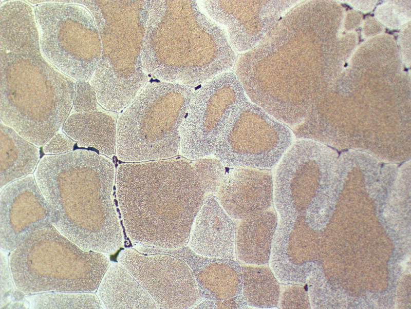 我用混合酸(氢氟酸 1ml,盐 酸 1.5ml,硝 酸 2.5ml,水 95ml)腐蚀T6态7075铝合金,10s,如图,放大200x 1、我想知道晶界附近的析出相是什么,η相? 2、晶粒内部中明显颜色不一样的中间部分(棕褐色)是什么? 3、为什么边部和中间部位的颜色不一样? 4、有别的好用的腐蚀剂吗,谢谢? |