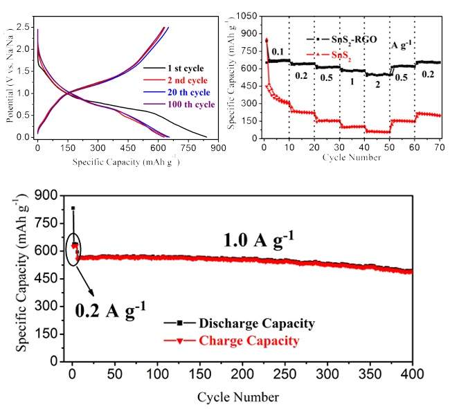 The design of the SnS2 -RGO hybrid structure for reversible storage of Na+ was based on the following materials principles: 1) a large interlayer spacing in the SnS2 structure benefi ting Na+ intercalation and diffusion, and more buffering space for beneficial adjustment the volume changes in the host during cycling; 2) fast collection and conduction of electrons through a highly conductive RGO network; 3) inhibition of Sn (NaxSn) aggregation during cycling by RGO after material hybridization. The SnS2 -RGO anode delivered a high charge (desodiation) specific capacity of 630 mAh g−1 at 0.2 A g−1 , and more impressively, 544 mAh g−1 after a ten-fold increase in current density to 2 A g−1 . The electrode was also very stable to cycling; providing a nearly unvarying capacity of 500 mAh g−1 at 1 A g−1 even after 400 charge-discharge cycles. http://onlinelibrary.wiley.com/d ... .201306314/abstract TOC.jpg |