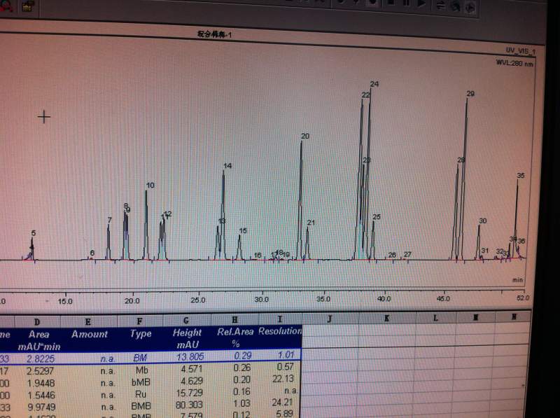 洗脱梯度是:乙腈-0.1%甲酸水 时间 乙腈 0 5% 5 8% 10 20% 15 20% 20 25% 30 30% 40 55% 怎么把8,9、11,12、22-25峰分开啊? IMG_1860[1].JPG |