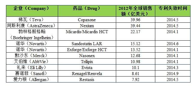 对于专利药来说,即将来临的2014年,并不算是一个大的专利失效年。根据美国制药和生物技术资讯机构FiercePharma数据,2014年因专利失效的药品销售额共计340亿美元,高于2013年的280亿美元,但远低于2012年的550亿美元。不过2015年这一数字又将攀升到660亿美元。 另外,这些专利药面临仿制药的竞争在2014年也不会太严重。根据eva luate Pharma的预测,在2014年,仿制药给专利药到来的损失只有130亿美元。 2014年专利失效的十大药物,数据来源于FiercePharma 但是如果你的公司突然遇到潜在的模仿者(仿制药公司),2014年也许并不是那么轻松。如以仿制药而闻名的梯瓦制药公司(Teva Pharmaceutical Industries),他们最畅销的一个药物品牌是Copaxone,一种用于治疗多发性硬化病的药物。梯瓦公司一直在努力开发另一种持续作用时间更长的药物,从而用新药品吸引病人,以取代专利将失效的Copaxone,而美国一家法院裁定该药物的专利期限2014年5月到期,而不是此前预期的2015年11月,这让梯瓦在美国30亿美元的销售额面临风险。 还有阿斯利康,也面临着紫色药丸Nexium的仿制药竞争,这种用于治疗胃酸倒流的专利药也将在2014年5月失效。2012年该药物的全球销售额达到39.94亿美元,其中23亿美元来自美国。所以,阿斯利康一直很担心这一天的到来。实际上,该公司也做了很多笔交易,旨在建立一个强有力的销售渠道以此减小Nexium销量的下滑。另外,阿斯利康在明年的时候也将会失去另外一种专利药Symbicort的部分专利。 2014年,一些公司甚至不止有一个专利药物到期。诺华将同时失去了药物Sandostatin LAR和Exforge的专利。Allergan公司也会失去药物Restasis和Lumigan的专利。其中Lumigan 会在明年8月到期,因此该公司正在竭力守卫另一个2027年失去专利的药物。最后,还有Warner Chilcott公司,该公司的所有药物基本上都会在2014年到期。如下对2014年10大专利失效药一一详细分析。 一.药物:Copaxone 公司: 梯瓦(Teva) 如同其他制药公司在面临重大危机时一样,梯瓦制药早就为药物Copaxone专利到期准备多年。2010年和2011年,该公司进行了一系列并购交易,如收购了用于生产治疗嗜睡症药物的两家公司Nuvigil和Provigil以及生产抗癌药物的Treanda公司。在这些交易之前,Copaxone的销售额占到公司专利药的2/3,几乎是梯瓦公司1/5的全年销售额。甚至在去年,药物Copaxone也为该公司的业绩增长贡献显着。 然而Copaxone2013年就辉煌不再了,首先是受到了诺华口服治疗药物Gilenya的竞争,另外Biogen Idec的药物Tecfidera正奋力直追,对其构成威胁。在其2013年第一季度创下17%的增长额后,Copaxone的增长空间被压制,第二季度仅增长了9%。这种趋势是否会持续到第三季度,仍有待观察。 梯瓦公司说,目前仍不知道市场上有哪一种仿制药可取代Copaxone,Copaxone是很难仿制的。他们并不认为市场上会立即出现一个仿制药以填补Copaxone失效后造成的缺位。但Mylan公司称他们已经做好准备并在等待这一时刻的到来,不过这家位于美国的医药公司CEO Jeremy Levin否认这一看法,并称机会还未来临。 二.药物:Nexium 公司:阿斯利康(AstraZeneca) 阿斯利康的专利药情况有点像三明治,而Nexium就是中间的肉片。其抗精神病药物 Seroquel去年失去专利后,销售额直线下滑。今年第二季度再次下跌31%,销售额仅为4.38亿美元。2016年,阿斯利康将失去降胆固醇的另一药物Crestor。而去年它成为了阿斯利康最畅销药,为其带来超过62亿美元的全球销售额。与此同时,医生和病人正将视线转移到它的仿制药Lipitor身上。于明年年中专利失效的常见胃药Nexium,在2012年为阿斯利康带来近40亿美元的销售额,尽管销售额下跌了10%,但这仍相当于该公司14%的药品销售总额。 当Nexium专利消失时,该药物的非处方药有望进入市场,从而削弱同类仿制药的竞争。但这个非处方药物是属于辉瑞,而不是阿斯利康,为此该公司去年就出售该药物的OTC权利与辉瑞达成了总共价值为2.5亿美元的一个交易。 事实上,阿斯利康,并没有在Nexium专利失效前打算填补这一空白。其呼吸系统药物Symbicort,是去年第二最好卖的药物,尽管市场竞争激烈,但仍在增长。药物BriliqueBrilinta仍反响平淡。在糖尿病方面,阿斯利康和其合作伙伴百时美施贵宝去年用70亿美元收购Amylin制药公司、Byetta公司和Bydureon公司和BydureonByetta,以此来提高在糖尿病药品领域的份额。 三.药物:Micardis/Micardis HCT 公司:勃林格殷格翰(Boehringer Ingelheim) 勃林格殷格翰的高血压药物Micardis(替米沙坦)将成为其在美国第一个专利失效的药物。事实上,公司的业绩也同这种药物的起伏不定。在2010年的一次综合分析中,它被列入血管紧张素受体拮抗剂(ARBs)可增加癌症风险的名单中,2011年FDA并没有问责ARBs,但最近FDA科学家ThomasMarciniak博士又重新谈论这个话题,并称在这个问题上他们将重新严格处理。 Micardis是勃林格殷格翰2011年被美国司法部处理的四种药物之一,之后该公司同意支付9500万美元了解此事。此外这家公司也被指控药物Micardis和其他几种药物在销售时以各种形式的回扣贿赂医生,让这家德国制药商备受尴尬。 该公司目前也并不看好Micardis,尽管在2012年4月份其在中国销售额增长了32%。但在今年上半年的财务业绩中Micardis名字就再也没有出现。 四.药物:Sandostatin LAR 公司:诺华(Novartis) 在诺华的药物研发中,药物SandostatinLAR的研发似乎没什么远见。在诺华最近的工作动向中,药物Afinitor被予以