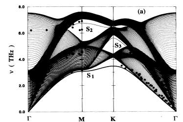 铜是单原子晶体,即布拉菲晶体,按固体物理理论,它的声子谱中的声学支,即当波矢k=0时,频率也为0。但是在表面声子谱中,k=0时,频率却有不为0的现象,如图中的Г点,其波矢k=0,但有些支的频率不为0,为什么??? phonon dispersion of Cu .jpg |