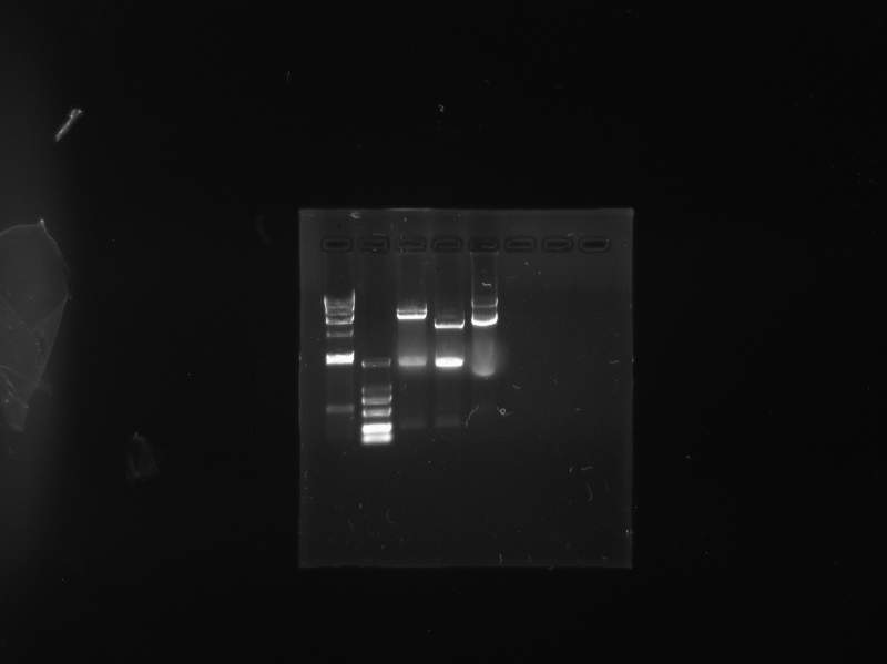 电泳图,第二个是DL2000,第三个是单酶切,第四个是双酶切,第五个是质粒,我的目的基因是1800bp左右,连的载体是pet28a,为什么质粒最前面还有条带,而且单切是两条带,求助 UVP15998Mar312014.jpg |