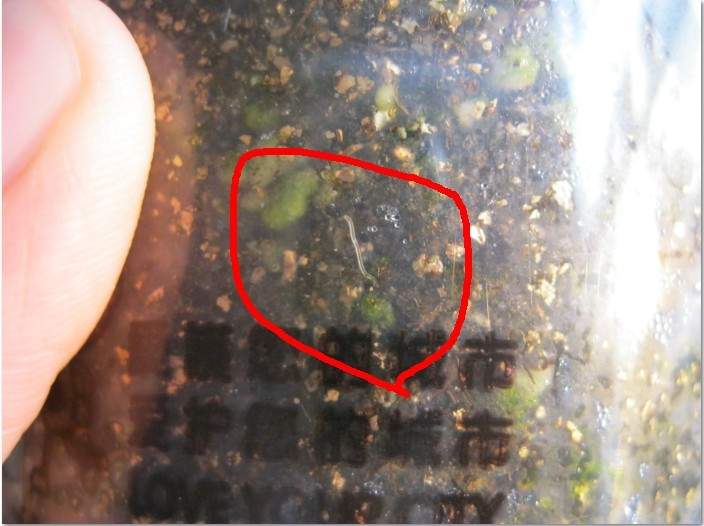 如图红色标记出来的部分,虫子长1-2cm,白色透明,喜欢在潮湿的土壤中。有时候花盆中的水浇多了就出来了,在植物腐烂的根部也有聚集。放在太阳下很快死亡,但是在潮湿的土壤中,生命力貌似很顽强。