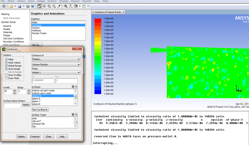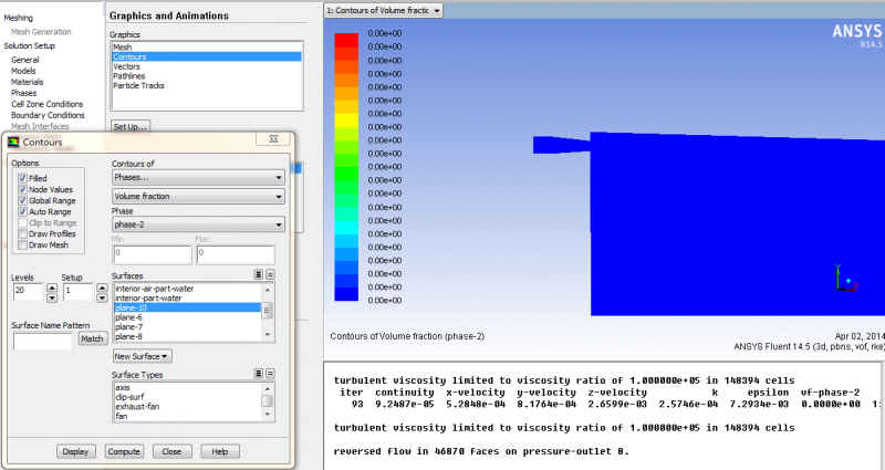 求助大神,我做的是一个水管中水喷射到空气中的射流模拟,用的是VOF,但是是个初学者,在基本设置中是不是有问题,导致我想看到两相的状态时,显示却是这样的,这是为什么啊(哪一个作为主相是不是有区别,在网上看到说一般来讲可压的作为主相,我就设置了空气为主相了),还有就是我只知道入口的速度和水管流量的要求,其他没有要求,边界条件如何设置啊,谢谢啦 第二相.png 第一相.png |