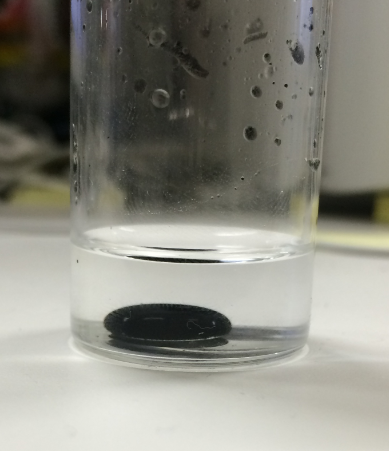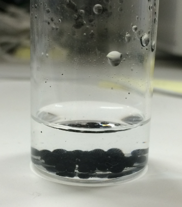 我将石墨烯和一种表面活性剂(液态)混合后,加入水中,石墨烯和表面活性剂形成球形沉在底层,浓度大约5mg/mL(石墨烯/表面活性剂)。球非常稳定,摇晃后会重新变回大球(如图2到图1)。