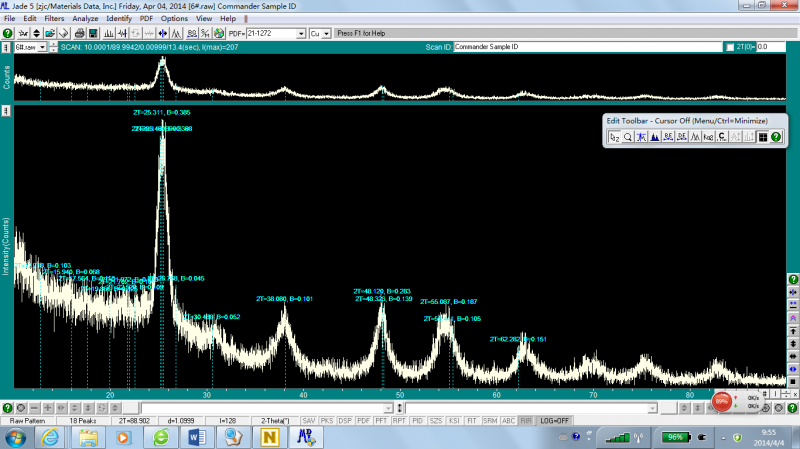 按照文献用Scherrer's formula D=kλ/βcosθ计算 通过XRD测定后λ=1.5418nm k=0.89 β是不是代入XRD中的FWHM值=0.876, θ=25.46 按照这个计算出来 =1.734927003但是电镜的结果为大约20nm 请高手帮助指出问题所在,谢谢! |