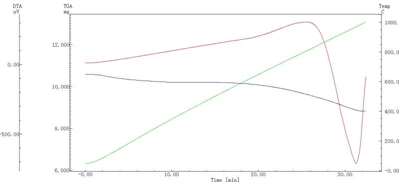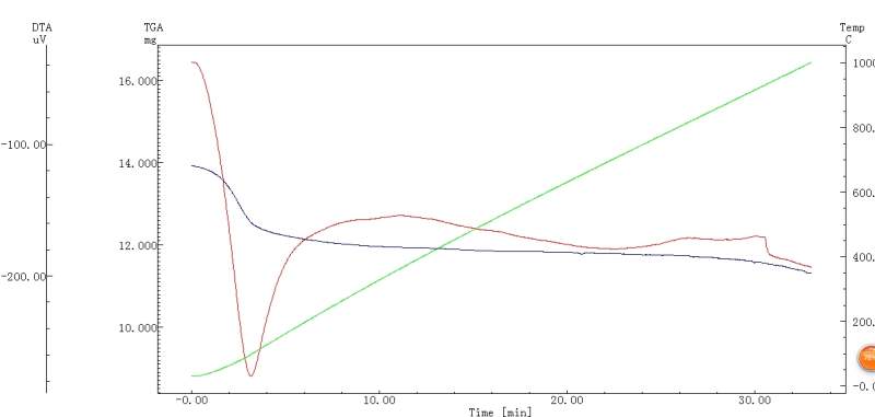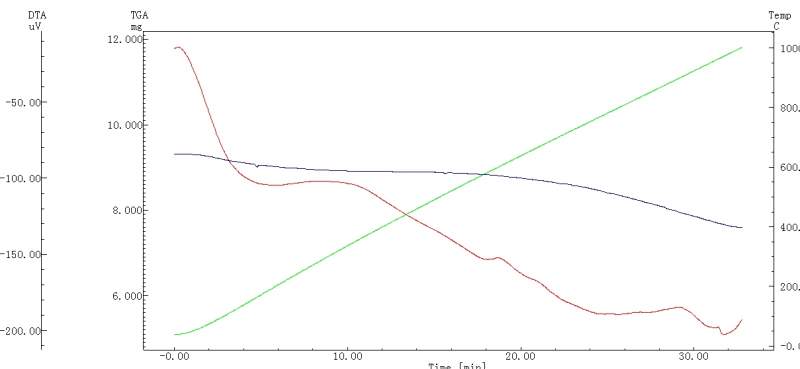 黑线是TG(热失重)曲线,红线是DTA(及能量)曲线,蓝线是随时间的增加,温度变化曲线。