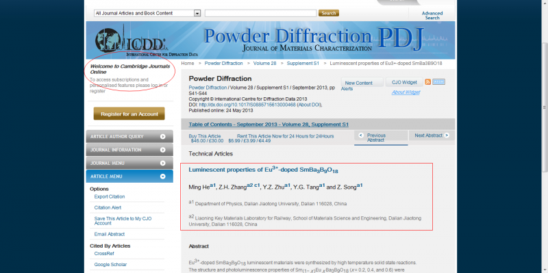 请同仁帮忙验证以下论文是否被Web of science (SCI)检索,请提供该论文被检索或不被检索的证据,以网络截图或者文档的形式均可。谢谢! Ming He, Z.H. Zhang, Y.Z. Zhu, Y.G. Tang, and Z. Song,Luminescent properties of Eu3+-doped SmBa3B9O18,Powder Diffraction 28 (S1) (2013) s41-s44. |