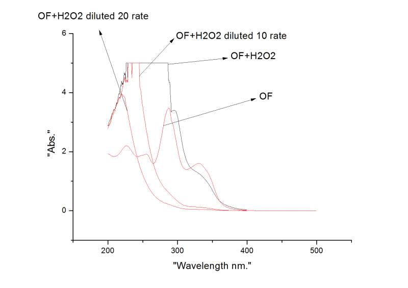 这几天做氧化铁/H2O2降解左氧氟沙星的试验,降解后的紫外图都测不到了氧氟沙星的峰,而是在紫外区出现了测不到的很高的峰,如图1: