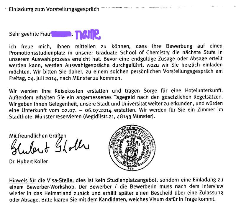 自我介绍/面试邀请 尊敬的。。。女士, 我很高兴的通知您,您的博士位置申请已进入了下一阶段的筛选。在最终决定之前我们衷心欢迎您前来进行有一次面谈。因此我们邀请您与7月4日到明斯特来进行一次自我介绍。 我们将会为您报销旅费并负责酒店住宿。另外您将会按规定得到适当的补助。我们可以为您提供游览我们城市和大学的机会并报销7月2日到6日的住宿费用(译者:也就是说你要多玩几天的话超出部分不报销)。我们会为您在明斯特的城市酒店订一间房,(括号里是地址)。 签证信息:这封信并非博士位置的确认,而是对于申请者的邀请。申请人必须在面试之后返回所属国家,在此之后会受到录取通知书或拒信。请您在签证官询问时如是解释。 |