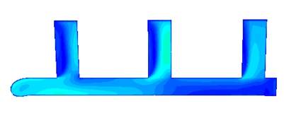 如图,空气从左侧进入,速度入口,流向三个分流管道,出口为负压,压力出口,出现的情况是从左向右三个分流管道的速度越来越大,求解释啊,是不是不符合常理啊,按理说最后这个管道的流速应该是比前两个小的吗不是?