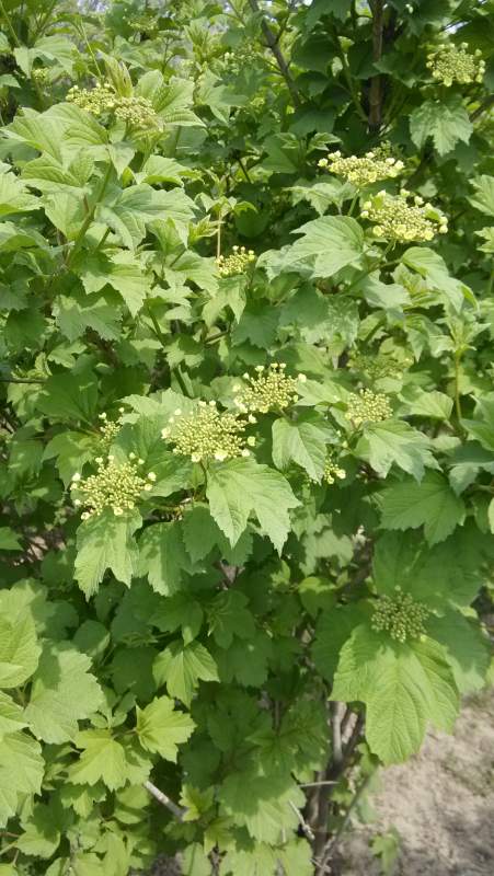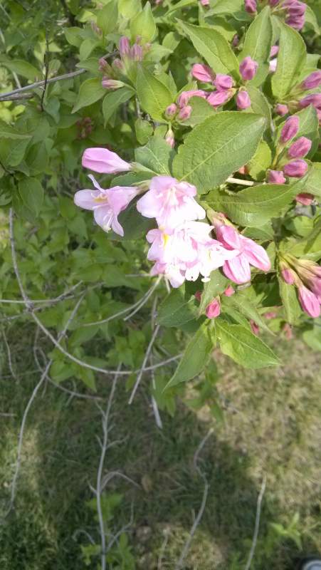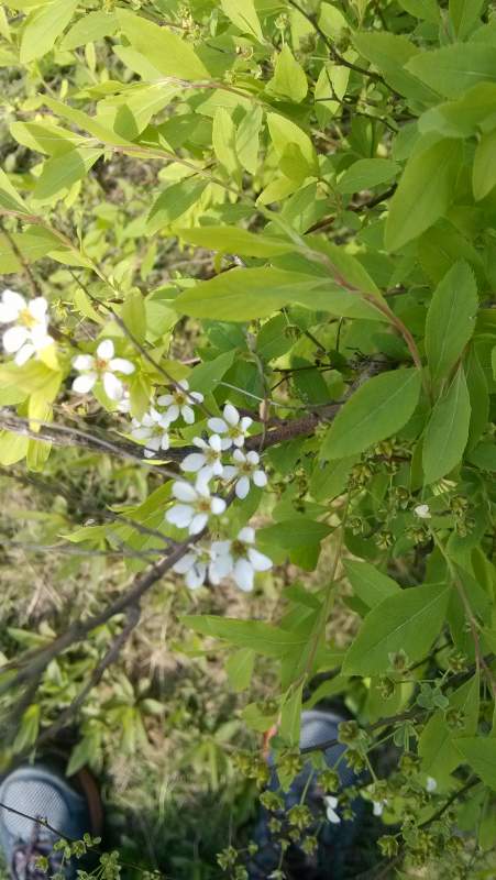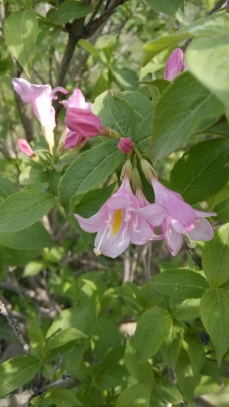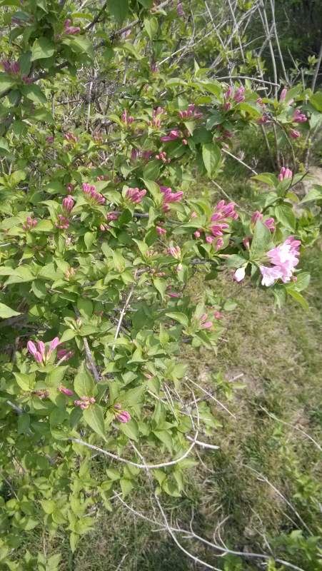 单瓣李叶绣线菊,某种荚蒾,锦带花,马蔺