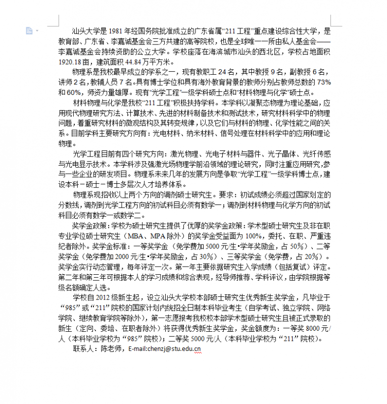 2014汕头大学物理系调剂信息(材料、光学工程)