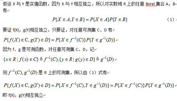 prove directly from the definition that if X and Y are independent and f and g are measurable functions,then f(X) and f(Y) are independent. 现代概率论基础一道题,谢谢 |
