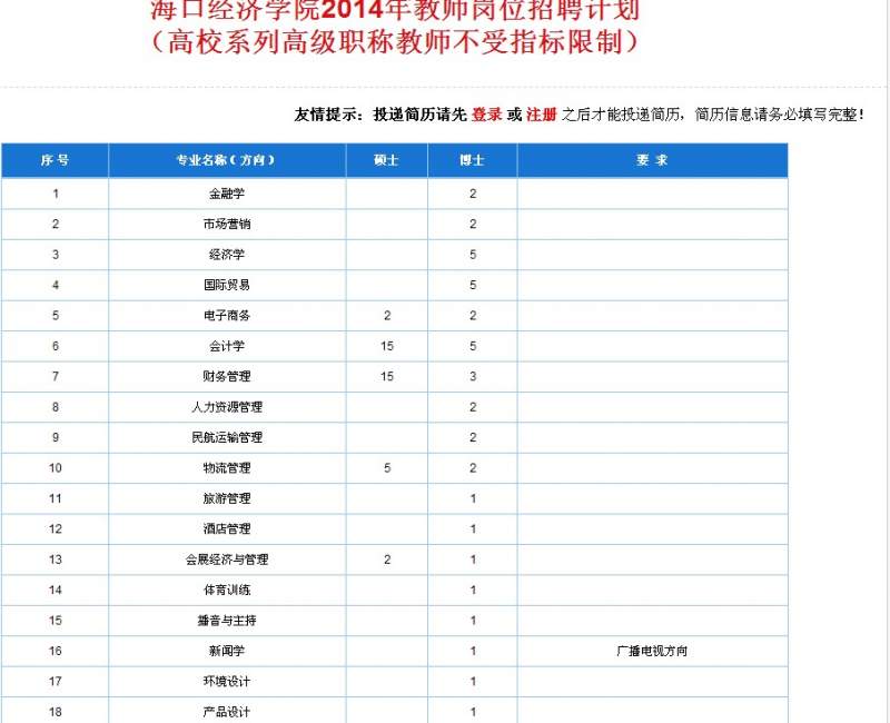 海口经济学院是一所以经济(公共)管理专业和特色专业为主的全日制普通民办本科院校。创办于1974年, 2008年3月26日教育部正式下文批准升格为本科院校。 学院位于海南省海口市高校区,校园占地面积1800多亩,建筑面积100多万平方米;教学仪器设备总值7902万元;图书馆大楼建筑面积达4万平米、阅览座位4000余个、馆藏图书114.5万册;拥有可容纳2800多人的大剧场和现代化的音乐厅与演播厅;体育设施齐全:有2个大型田径运动场,1个综合体育训练馆,游泳室内(外)馆及多个灯光篮球场、排球场与网球场。 全日制在校生2.2万人,本科生比例超过六成。学院下设经济贸易学院、工商管理学院、公共管理学院、旅游管理学院、艺术学院、美术学院、传媒学院、信息工程学院、工程技术学院、继续教育学院、外国语学院等11个二级学院及基础课程教学部、体育教学部(系)、思想政治理论教学部、公共外语教学部等4个教学部(系)。开设国际经济与贸易、计算机科学与技术、旅游管理、新闻学、财务管理、交通运输、音乐表演、播音与主持、电子信息工程、英语、工程管理、经济学、日语、通信工程、人力资源、土木工程、市场营销、社会体育、艺术设计、电气工程及其自动化等28个本科专业(方向)和金融管理实务、会计、空中乘务、旅游管理、酒店管理、环境艺术设计、商务日语、汽车检测与维修技术等一批适应社会需要、就业前景看好的专科专业,面向全国30个省、市、自治区招生。 学院坚持用真诚和待遇吸引人,用事业和环境凝聚人,用精神和制度激励人,努力营造“凝聚、和谐、平等、包容”的新型人际关系,人才引进措施有力,一批批优秀的人才纷纷加盟。学院现有教职工1400多名,专任教师1000余名,其中具有高级职称者239名、硕士以上学历者443名;享受国务院政府特殊津贴专家5名,海南省有突出贡献优秀专家1名,海南省高校教学名师5名,省级先进教育工作者5名,“省高校青年教师教学十佳”3名;聘请了20多名年轻的博士后为兼职教授、30多名国内知名专家学者为客座教授。 学院秉承“科研兴校”的发展思路,成立了人文与经济研究院,下设艺术、经济、旅游三个研究所。近几年来,教师共发表学术论文1600多篇,其中在中文核心期刊和被SCI、EI发表和检索的论文176篇。出版学术专著和教材155部,自编教材62部(册)。在省厅级以上学术会议上交流论文245篇。已批准立项的省、部级以上研究项目183项,其中国家高等教育学会项目3项,教育部重点规划项目1项。获奖著作、论文、艺术作品、多媒体课件有500部、篇(件),其中获省级一等奖以上80项。 南中国海的壮阔,五指山的雄伟,万泉河的秀丽,南渡江的妩媚,赋予了海口经济学院无穷的魅力。学院将一如既往地以“教育设施高标准、教学质量高水准、学院形象高品位”的崭新风貌,开创更好更快发展的新局面,奋力朝着海口大学的宏伟目标前进。 海口经济学院为您打造事业平台,助您成就事业,热忱欢迎优秀人才加盟! 海口经济学院2014年学科建设岗位招聘计划 (一)、专业(学科)带头人条件 年龄应当在55周岁以下,具备如下条件: 1、具有教授职称,或者具有博士学位和副高职称。 2、科研方向明确稳定且符合学院办学定位及学科专业发展需要,多年从事该学科领域的研究,掌握该领域最新发展动态,并且有创新的学术思想。具有领导和组织本学科中青年学术梯队在其前沿领域赶超国内先进水平的能力。 3、近5年内主持过国家级项目或省部级重大、重点项目;或作为主要完成人参与过国家863、973、国家杰出青年科学基金项目、国家自然科学、社会科学重大项目;或获国家发明专利并产生了显著的社会经济效益。 4、近5年内作为主要完成人,获得过省部级二等奖以上的科研成果奖或教学成果奖;以第一作者在本学科国内权威学术刊物上(一级学科的协会会刊)发表有影响的学术论文2篇以上。 5、学院发展迫切需要的特殊专业或少数紧缺专业的引进人才条件可适当放宽。 (二)、专业(学科)骨干条件 年龄应当在50周岁以下,具备如下条件: 1、博士或副教授以上职称。 2、科研方向明确稳定且符合学院办学定位及学科专业发展需要,多年从事该学科领域的研究,掌握该领域最新发展动态,具有较强的创新能力和较大的发展潜能。 3、近5年内主持过省部级以上科研项目,或作为主要完成人参与过国家级项目。 4、近5年内作为主要完成人,获得过省部级三等奖以上科研成果奖或教学成果奖;以第一作者在中文核心期刊上(北京大学版本学科类)发表学术论文3篇以上。 5、学院发展迫切需要的专业特殊或少数紧缺专业的引进人才条件可适当放宽。 海口经济学院2014年教师岗位招聘计划(高校系列高级职称教师不受指标限制) 海口经济学院2014年引进人才待遇 1 专业学科 带头人 教授或博士副教授 55岁以下 15-30万 2 专业学科 骨干 博士或副教授以上 50岁以下 10-15万 3 教 师 教 授 65岁以下 12-15万 副教授 9-12万 博 士 35岁以下 9-12万 硕 士 6-7万 1、应聘者填写“应聘人员申请表” (学院网站“师资队伍”下载),全面、真实地反映个人的学术成果和业绩的材料和“生活近照1张”请以附件形式一并发至我校招聘邮箱,发送标题为“姓 名”+ “某某专业教师”。 2、学校收到个人申请后组织校学术委员会或有关专家对应聘对象进行面试,合格后报院务