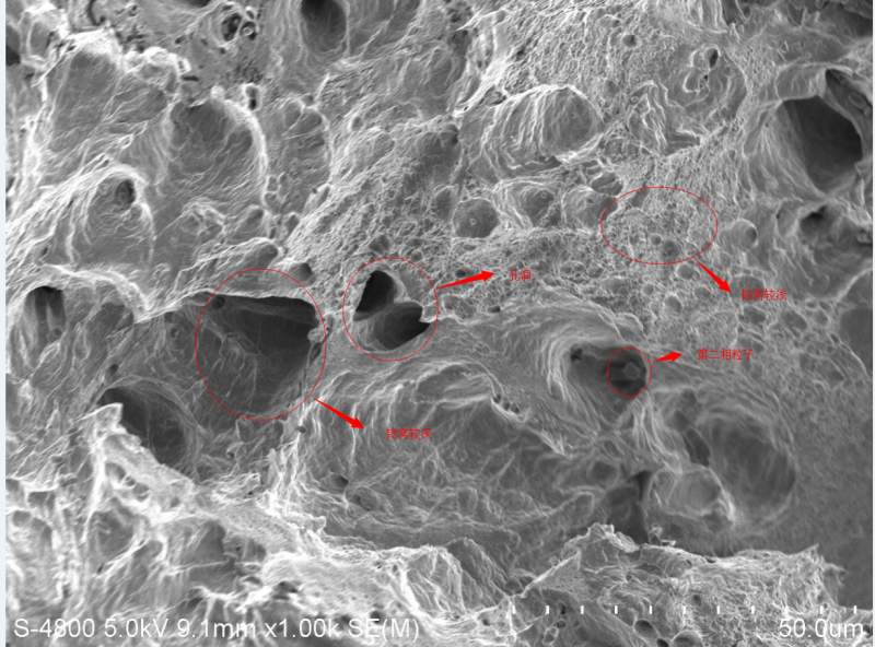 材质304不锈钢,常温拉伸断裂,延展率50%,自己分析觉得是微孔聚集型断裂,韧窝呈拉长状态,不知道分析得对不对,不过对于韧窝为什么会有大有小,有深有浅则不知道该怎么分析,有些地方韧窝感觉太浅了有些太深了。 _W%U}$N`CYC)Z8P90)CY(S4.jpg |