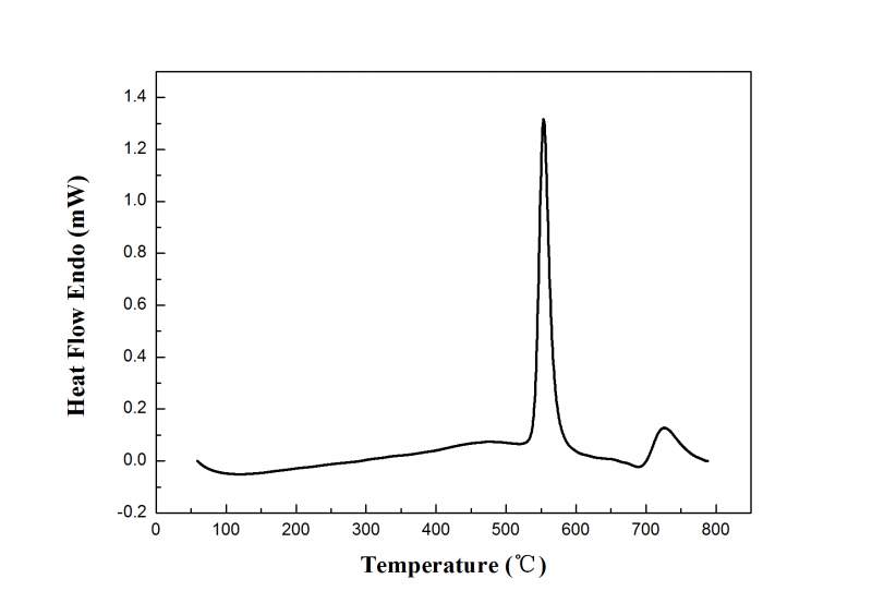 对非晶合金进行非等温DSC曲线测试,可以得到晶化起始温度Tx和晶化峰值温度Tp。可是如何得到玻璃转变温度Tg的呢?