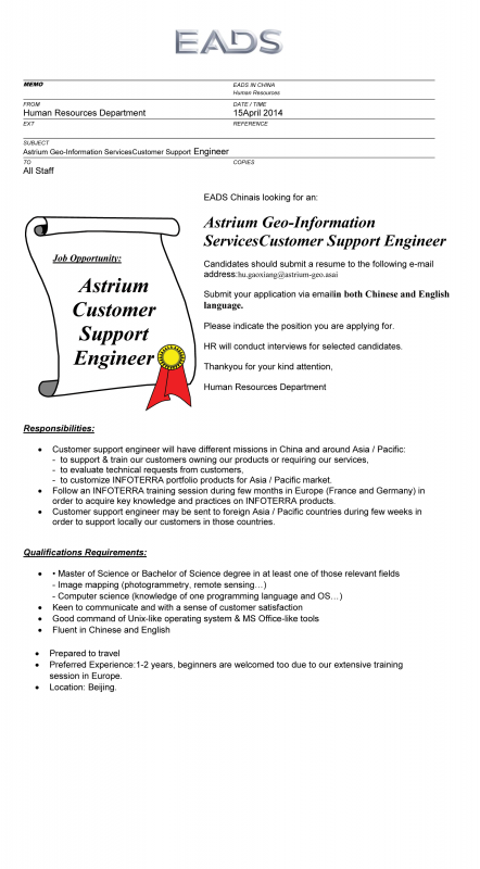 MEMO EADS IN CHINA Human Resources FROM Human Resources Department DATE / TIME 15April 2014 EXT REFERENCE SUBJECT Astrium Geo-Information ServicesCustomer Support Engineer TO All Staff COPIES Responsibilities: • Customer support engineer will have different missions in China and around Asia / Pacific: - to support & train our customers owning our products or requiring our services, - to evaluate technical requests from customers, - to customize INFOTERRA portfolio products for Asia / Pacific market. • Follow an INFOTERRA training session during few months in Europe (France and Germany) in order to acquire key knowledge and practices on INFOTERRA products. • Customer support engineer may be sent to foreign Asia / Pacific countries during few weeks in order to support locally our customers in those countries. Qualifications Requirements: • • Master of Science or Bachelor of Science degree in at least one of those relevant fields - Image mapping (photogrammetry, remote sensing…) - Computer science (knowledge of one programming language and OS…) • Keen to communicate and with a sense of customer satisfaction • Good command of Unix-like operating system & MS Office-like tools • Fluent in Chinese and English • Prepared to travel • Preferred Experience:1-2 years, beginners are welcomed too due to our extensive training session in Europe. • Location: Beijing. EADS.png |