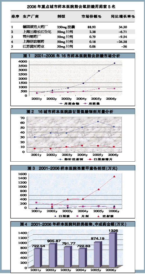 熊去氧胆酸是以动物、禽类的胆汁为原料经过半合成提取而制得,现在国内具有生产批文企业为48家,原料药主要由上海三维制药生产,而日本三菱东京制药、韩国DAEWOONG CHEMICAL的熊去氧胆酸原料药是作为进口补充和替代品种。熊去氧胆酸是我国零售领域和重点城市样本医院市场销售额增长率较快的消炎利胆类药物,2006年16城市样本医院用药金额为4000万元,同比上一年的3252万元增长了22.97%,在样本医院所用的消炎利胆类药品中以36.4%的市场份额占据了第一位。