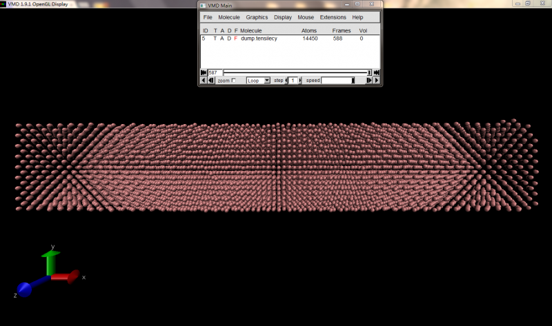 Lammps对单晶铜进行弛豫,体积忽然增大,内存异常,vmd查看发现体积基本不变 in.文件 boundary p s s units metal atom_style atomic dimension 3 neighbor 2.0 bin neigh_modify delay 2 every 1 check yes lattice fcc 3.61 region box block 0 50 0 8 0 8 create_box 1 box create_atoms 1 box mass 1 63.546 pair_style eam pair_coeff * * Cu_u3.eam region 1 block INF 1 INF INF INF INF region 2 block 49 INF INF INF INF INF group left region 1 group right region 2 group boundary union left right group mobile subtract all left velocity left set 0.0 0.0 0.0 dump 1 all atom 1000 dump.tensilecy min_style sd minimize 1.0e-6 1.0e-6 1000 10000 fix 1 left setforce 0.0 0.0 0.0 fix 2 all npt temp 300 300 1 x 0.0 0.0 10.0 drag 1.0 thermo 1000 timestep 0.002 run 40000 unfix 2 fix 2 all npt temp 300 300 100 x 0.0 0.0 10.0 drag 1.0 thermo 1000 timestep 0.002 run 900000 |