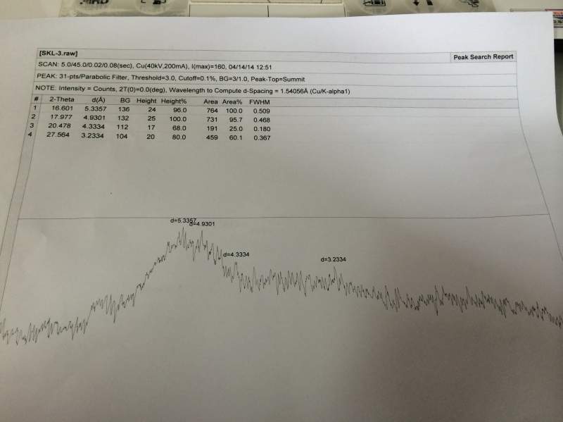 图一为壳聚糖膜的XRD结果 图二为壳聚糖/壳聚糖季铵盐+碳纳米管复合膜 图三为壳聚糖/壳聚糖季铵盐+碳纳米管复合膜经过全氟辛基磺酰氟处理 基本不懂XRD结果 求分析第三张图为什么会17.977和27.564处出现新峰,还有为什么壳聚糖膜在10处均没有出现峰值? 三.JPG 二.JPG 一.JPG |