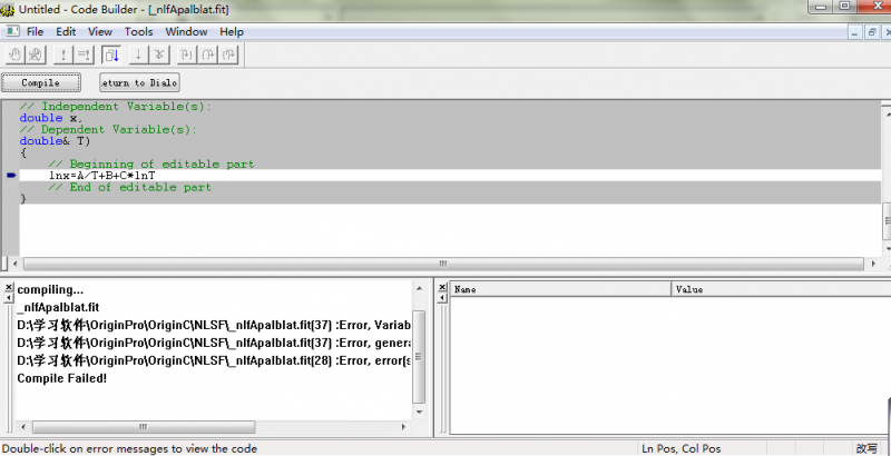 如何用这个函数lnx=A/T+B+C*lnT拟合曲线。。。求解,为什么在生成函数时出错呢