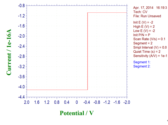10E-16.。。开神马玩笑,这显然是断路,就算不是断路这个电流大小CHI也绝对不可能测的准的,核对所有线还有电极系统吧,必要时候用标准电池测试工作站是否正常