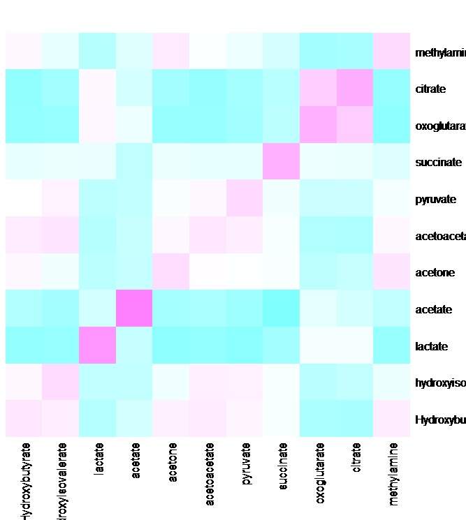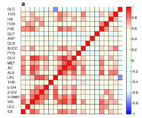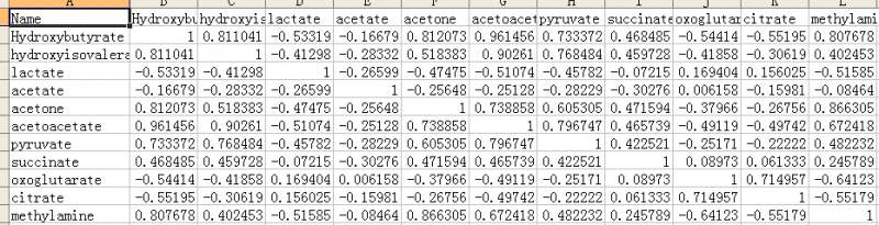 我有2组物质,用spss作出了它们的相关性,现在我想用R语言画一个相关性的热点图(heatmap),相关性的数值从-1至1要用蓝色到红色表示,如图所示。谁能写一段代码呢? 补充下:按照http://flowingdata.com/2010/01/2 ... -and-easy-solution/的教学,已经能作出初步的图了,但是还是有几个问题: 1、我数据明明是这样分布的:第一列是从Hydroxybutyrate开始的 但是做出来的图片的分布却变了,第一列是从methylamine开始了,Hydroxybutyrate掉到最下面去了,而且左下角到右上角的对角线的格子的颜色为什么回是不一样的,应该都是1才对啊? 2、图的颜色我想做成-1至1是从蓝色到红色的效果,并且最好旁边能出来一条表示颜色变化的图。 或者用matlab来做,我用matlab做出来只有红、绿、黑三种颜色,如何才能作出更多的颜色,就像第一个图那样。 |