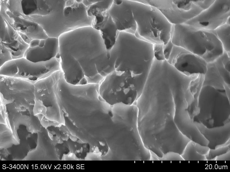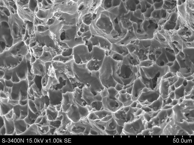 整体上看感觉存在大量韧窝和晶粒拔长,应属韧性断裂。但断面中也隐约可看到一些空洞,这些空洞可能就是受外力载荷作用时首先发生应力集中和断裂的裂纹源,是造成材料力学性能下降的原因。