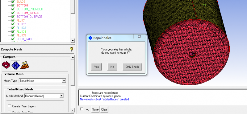 我检查过了,没有孔啊,里面有个桶是没有流体的,所以我就把那桶状结构挖去了,如图,是不是这个缘故呀,还有怎么只有面网格呀,本来流体域内都是网格呀,大神们帮忙啊,新手屡屡碰壁呀