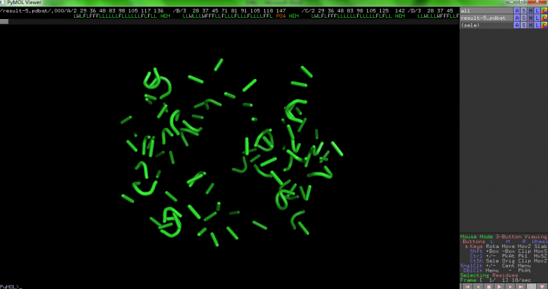 求助,autodock的结果输出为pdb格式,用pymol打开发现同一个蛋白里的氨基酸被分为好几部分,结果想显示为ribbon结构时,只出现一个一个小线段,求解释,求帮忙!!结果见图: pymol.png |