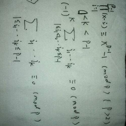 引理1: 如果p>2是素数, (p-1)不整除正整数n, 那么 Sum_{1<= k <= p-1} k^n =0 (mod p) 证明:mod p 有原根 (可以参考https://zh.wikipedia.org/wiki/%E5%8E%9F%E6%A0%B9),设为c, 即c的阶为(p-1). 由n的条件知 c^n 不等于 1 (mod p). 然而 Sum_{1<= k <= p-1} k^n = c^n Sum_{1<= k <= p-1} k^n (mod p) 所以Sum_{1<= k <= p-1} k^n =0 (mod p) 引理2: Sum_{1<=i, j, k <=p-1} ijk =3! * Sum_{1<=i <j <k <= p-1} ijk + 3 * Sum_{1<= i ,k <= p-1} i^2*k 证明:好像是显然的,但讲不清楚, 略。 由引理1和引理2, 加上 3!=6 (mod p) 当 p>5时可逆, 所以命题成立 p | Sum_{1<=i <j <k <= p-1} ijk. |