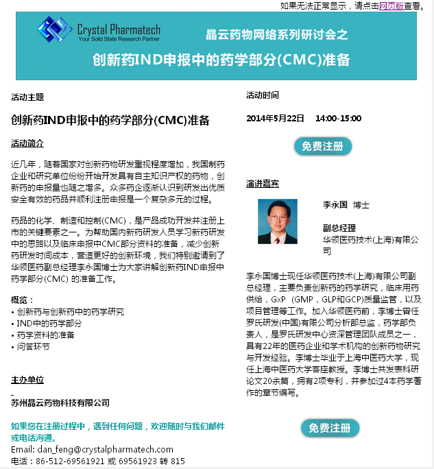 主题:创新药IND申报中的药学部分(CMC)准备 时间: 2014年5月22日(周四)14:00-15:00 概况: • 创新药与创新药中的药学研究 • IND中的药学部分 • 药学资料的准备 • 问答环节 免费注册地址:http://www.crystalpharmatech.com.cn/ch/newsletter/w-1.html 简介: 近几年,随着国家对创新药物研发重视程度增加,我国制药企业和研究单位纷纷开始开发具有自主知识产权的药物,创新药的申报量也随之增多。众多药企逐渐认识到研发出优质安全有效的药品并顺利注册申报是一个复杂多元的过程。 药品的化学、制造和控制(CMC),是产品成功开发并注册上市的关键要素之一。为帮助国内新药研发人员学习新药研发中的思路以及临床申报中CMC部分资料的准备,减少创新药研发时间成本,营造更好的创新环境,我们特别邀请到了华领医药副总经理李永国博士为大家讲解创新药IND申报中药学部分(CMC) 的准备工作。 演讲嘉宾: 李永国 博士 副总经理 华领医药技术(上海)有限公司 李永国博士现任华领医药技术(上海)有限公司副总经理,主要负责创新药的药学研究,临床用药供给,GxP (GMP,GLP和GCP)质量监管,以及项目管理等工作。加入华领医药前,李博士曾任罗氏研发(中国)有限公司分析部总监,药学部负责人,是罗氏研发中心资深管理团队成员之一,具有22年的医药企业和学术机构的创新药物研究与开发经验。李博士毕业于上海中医药大学,现任上海中医药大学客座教授。李博士共发表科研论文20余篇,拥有2项专利,并参加过4本药学著作的章节编写。 1.png |