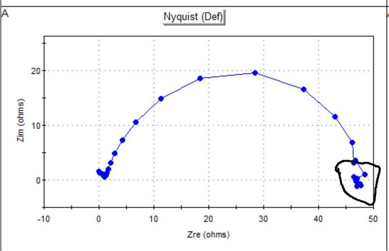 小弟最近在做化学镀镍的实验,镀后在硫酸中做电化学实验得到的交流阻抗图谱,在0下面出现了一些点,黑色圈的部分。求大神帮忙分析应该怎么处理,拜谢!!!