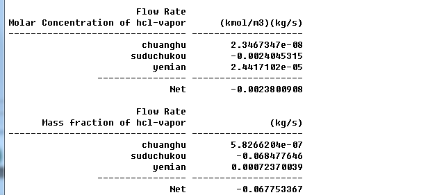 但是现在结果是这样的:通过report里的surface intergrals的flow rate——species的mass fraction of hcl观察结果,但是现在有一个很奇怪的问题,排风口的hcl质量流量比液面散发的质量流量大很多,差了大约两个数量级,请问是哪里算错了呢?希望大神可以帮助我!!!!!!