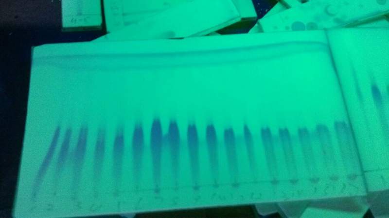 这个三萜化合物,怎么会拖尾这么厉害,对于三萜类的化合物怎么分离比较合适,单纯的硅胶分离感觉不是很给力,柱子是装的越长越好吗,怎么才能让柱子跑的跟板子上的点那样啊,感觉很无助,还有就是针对那些跑出来 是一个长条的那种怎么办,当色带处理吗,色带有什么特征呢? 10A02E4E370E6AEF4ECEB47D1F5EE99F.jpg |