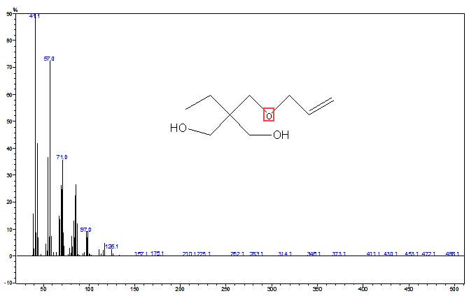 实验得到一张质谱图,麻烦各位大哥帮忙解析一下这,含有结构式。
