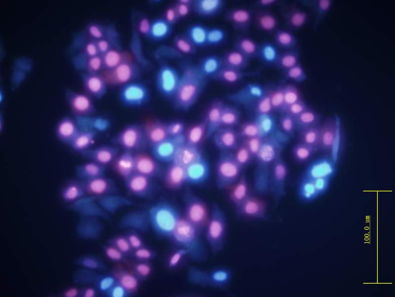 细胞经过物理结合化学疗法36 小时后, 用hoechst 染色 和PI染色,观察期形态。