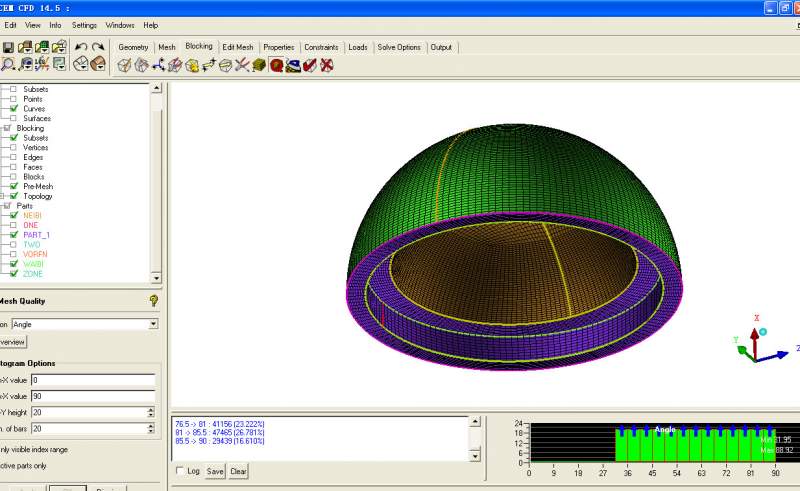 ICEM CFD半球壳划分问题: 几何结构如下: 采用icem划分六面体网格,block为: 划分后主要如下: 基本趋势是对的,可是有部分网格质量很差: 请问这个是什么原因?是不是第二层最里圈的一条线没能关联? 谢谢。 |