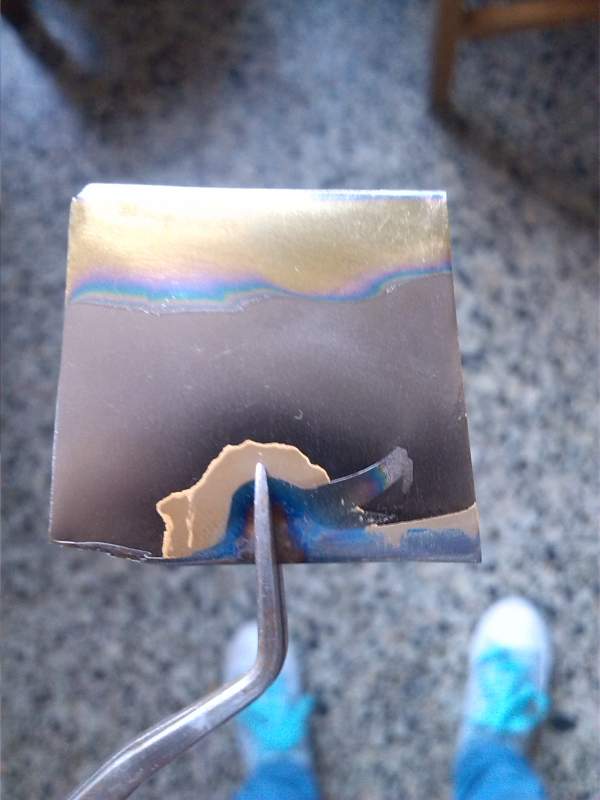 我用的电解液0.3%NH4F,2%H2O的乙二醇溶液,二次氧化法,60V电压先氧化2h,然后用双氧水去除钛箔表面物质,然后60V电压下氧化9h,去离子水、乙醇超声清洗,150度保温2h,直接500度保温3h,结果表面就成了蓝色。