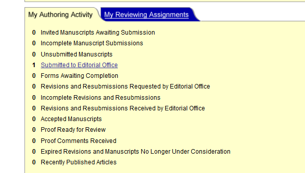 请教各位有经验的虫友,我的Manuscript上传后,副编辑发来邮件要完成版权协议: To access the electronic Journal Publishing Agreement, please log in to your ACS Paragon Plus Home page at https://acs.manuscriptcentral.com/acs. Click on either the "Submitted Manuscripts" or the “Forms Awaiting Completion” queue and then click on the "Complete Journal Publishing Agreement" link. 但是我现在的状态是: 请问版权协议我怎么提交,望各位虫友指点! TM截图20140426080949.png |