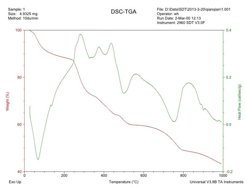 我用草酸钛钾、硝酸、硝酸锶制成胶体后煅烧合成钛酸锶,请问它的TG-DSC图谱该如何分析?求高人指点