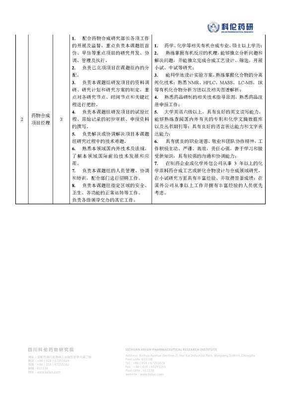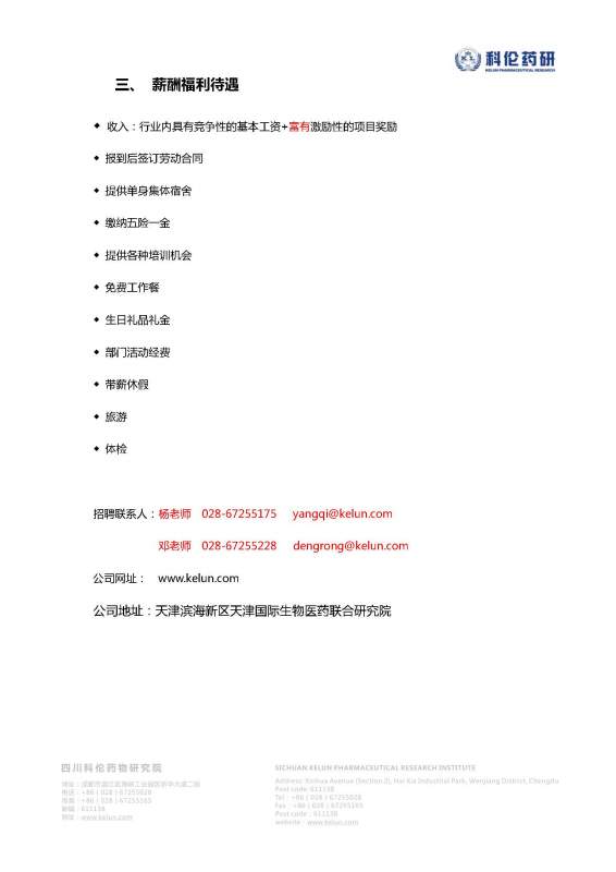 四川科伦药物研究院现计划招聘药物合成人员若干名,欢迎药物化学、有机化学等相关专业优秀勤奋的同志们加入,工作内容主要是药物合成小试、中试、注册申报等,有工作经验、应届生均可,要求本科及以上学历。 同时,公司招聘药物质量分析人员若干。 工作地点:成都市温江区海峡工业园区 l联系方式: 研究院人力资源 杨老师 028-67255175 yangqi@kelun.com 也可联系我 药物合成部 zhangxiangdrug@163.com 科伦集团创立于1996年,现拥有国内外87家子(分)公司。集团产业板块,科伦药业于2010年上市,是全球最大的大输液专业制造商和运营商。 2012年科伦集团营业收入超过288亿元、利税超过20亿元人民币。根据商务部发布的2012年中国药品流通行业销售排序和工信部医药统计年报,科伦集团旗下的商业和产业双双进入全国前十强。销售额、利润额在四川医药企业中排名第一。 四川科伦药物研究院,是科伦药业总部研发中心,始建于1998年,位于四川成都。研究院新建研发大楼(温江海峡工业园区)已于2013年5月投入使用,一期占地面积36亩,总投资一亿多元。现拥有药物研究人员350余人,形成了从选题立项与合作、仿制与创新药物开发、药理和临床研究到项目注册与综合管理的14个专业技术部门,构建了从原料合成到项目申报的完整研发体系,并计划在未来2-3年内扩增至500人规模,形成由不同专业优秀科学家领军的、致力于创新和高技术内涵药物研究的国内一流研发团队。 全面推进高端药物产品线,进行高技术内涵药物的研发。突出对临床急需的早仿、首仿药物、新型释药系统、创新型小分子和生物技术药物的研发。 四川科伦药物研究院建立了多个国家和省市级创新平台,包括国家级企业技术中心、国家地方联合工程实验室、国家大容量注射剂工程技术研究中心、国家博士后工作站、科伦创新药物孵化基地等。 dbecd688-06ee-4dc5-b8a5-6670cc36bc5c (1).jpg 四川科伦药物研究院在成都总部广纳贤士的同时,成立天津科伦药物研究有限公司,现已同时启动天津科伦药物研究有限公司招聘,第一阶段,招聘药物合成、质量分析、制剂项目经理及研究人员若干名(详见附图招聘简章)。 天津科伦药物研究有限公司成立于2014年08月,坐落于美丽的天津滨海新区天津国际生物医药联合研究院,依托联合研究院的药物发现平台、药物分析测试平台、生物药中试平台和临床研究院平台等,迅速构建科伦研究院的北方研究机构。 2014年天津科伦药物研究招聘简章_页面_1.jpg 2014年天津科伦药物研究招聘简章_页面_2.jpg 2014年天津科伦药物研究招聘简章_页面_3.jpg 2014年天津科伦药物研究招聘简章_页面_4.jpg 2014年天津科伦药物研究招聘简章_页面_5.jpg 2014年天津科伦药物研究招聘简章_页面_6.jpg 2014年天津科伦药物研究招聘简章_页面_7.jpg [ Last edited by zhangxiang169 on 2014-7-22 at 12:02 ] 四川科伦药物研究院、天津科伦药物研究院 招聘药物合成、质量、制剂研究人员 [ Last edited by zhangxiang169 on 2014-7-22 at 12:05 ] 天津和成都简历均投至 yangqi@kelun.com [ Last edited by zhangxiang169 on 2014-7-24 at 15:10 ] 简历中请注明是应聘天津还是成都 [ Last edited by zhangxiang169 on 2014-7-24 at 16:20 ] |
