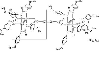 不是学化学的, p-anisyl,对苯甲醚基 amidine,眯 formamidinate,甲眯盐? 合起来,N,N‘-二-对苯甲醚甲眯盐 结构大概如此: 这是一个这玩意的化合物 formamidinate.jpg [{Mo2(DAniF)3}2([mu]-O2CC6H4CO2)] (DAniF is N,N'-di-p-anisylformamidinate, C15H15N2O2).jpg |