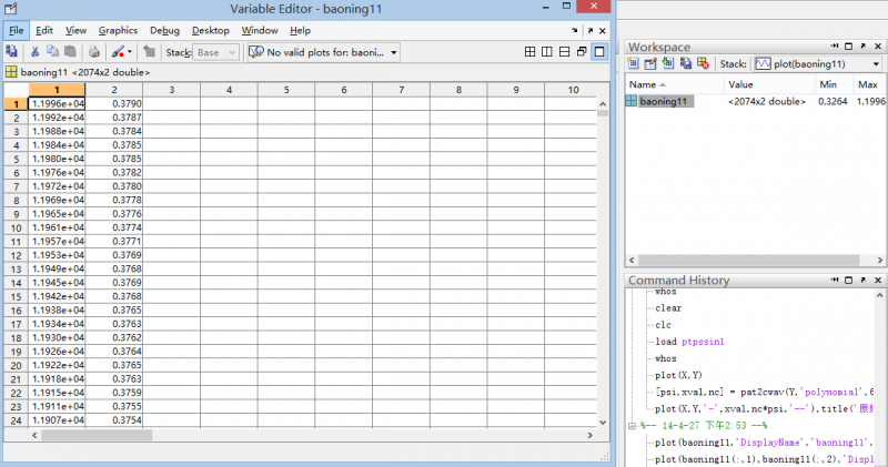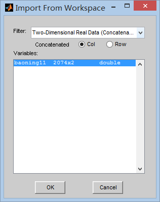 直接在小波工具箱里导入数据,不知道怎么定义X轴Y轴,所以默认得出来的图完全不是想要的。 是不是非要以代码的形式处理数据呀? 希望高手提点~! wavemenu.png 应该得到的谱图.jpg 导入数据时候的选项.png 实际得到的图.png 这是我的数据.png |