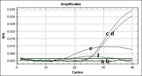 小弟刚用Taqman探针做的结果,a、b是阴性对照,c、d是阳性对照,e、f是包被巯基标记的DNA纳米金溶液,为什么会出现?